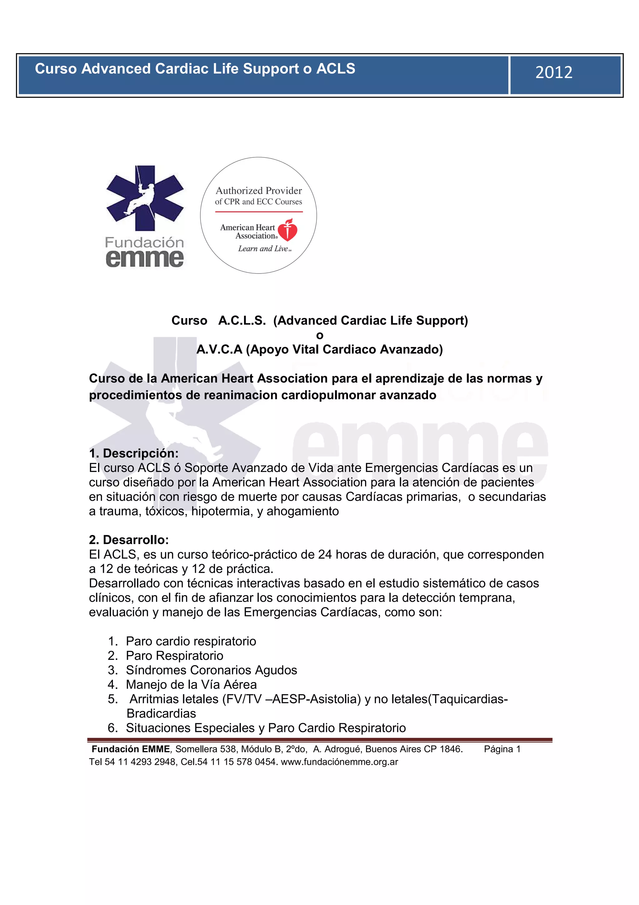 El documento describe un curso de Apoyo Vital Cardíaco Avanzado (ACLS) de 24 horas diseñado para enseñar procedimientos de reanimación cardiopulmonar avanzada. El curso cubre temas como paros cardíacos, arritmias, síndromes coronarios agudos y accidentes cerebrovasculares. Los objetivos son que los estudiantes aprendan a reconocer y tratar emergencias cardíacas de manera sistemática. El curso está dirigido a profesionales médicos y de enfermería y otorg