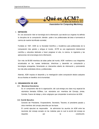Las 4 organizaciones que han desarrollado guías para la currícula de computación son: ACM desde 1968, AIS desde 1994, AITP desde 1985, e IEEE-CS desde 1977. Estas organizaciones han trabajado juntas y actualizado regularmente sus recomendaciones de currícula para mantenerse al día con la rápida evolución de la computación e informática. La ACM y la IEEE-CS lideraron una revisión conjunta importante de la currícula en 1991.
