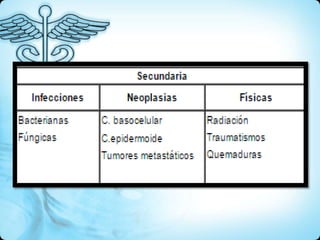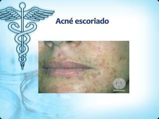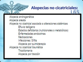 1) El documento describe las características del cabello humano, incluyendo sus distintas fases de crecimiento y caída, así como las causas más comunes de pérdida anormal del cabello. 2) También se detalla la patogénesis, manifestaciones clínicas y tratamiento del acné, hirsutismo y otros trastornos relacionados con los andrógenos. 3) Se explican varias enfermedades de la piel como la alopecia areata, rosácea y otras dermatosis que afectan el cabello y