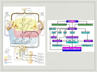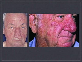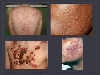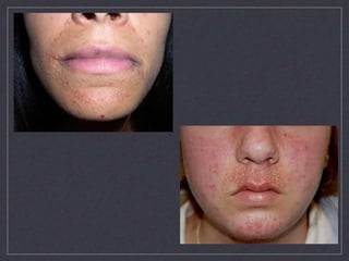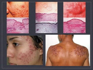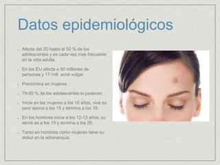 El documento detalla la prevalencia del acné y la rosácea, destacando que el acné afecta entre el 20% y 50% de los adolescentes, y puede ser más común en mujeres. Se discuten factores de riesgo, clasificaciones, cuadros clínicos y tratamientos para ambas condiciones, así como sus diferencias, como la ausencia de comedones en la rosácea. Además, se abordan mitos y factores agravantes del acné, proporcionando un enfoque integral sobre su patogenia y manejo.