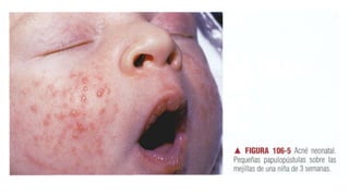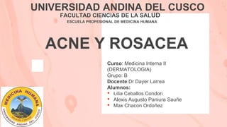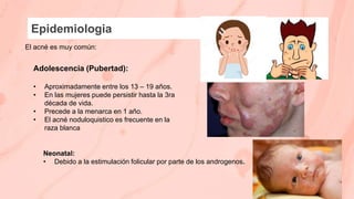 Este documento presenta información sobre acné y rosacea. Cubre temas como la epidemiología, patogenia, manifestaciones clínicas, clasificación, complicaciones, diagnóstico diferencial y tratamiento del acné. También describe variantes del acné como el acné neonatal, infantil, conglobata, fulminante, excoriado y asociado con anormalidades endocrinas. Además, discute erupciones acneiformes producidas por fármacos, radiación, el trabajo y el calor.
