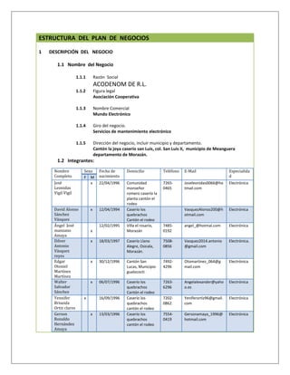 Este documento presenta un plan de negocios para una cooperativa llamada ACODENOM DE R.L. que brindará servicios de mantenimiento electrónico en la zona norte de Morazán. Describe la razón social, integrantes, misión, visión y valores. Explica que existe una demanda insatisfecha en la zona y que la cooperativa suplirá servicios de mantenimiento preventivo y correctivo de equipos electrónicos de audio y video a domicilio. Incluye un presupuesto de equipos, herramientas y materiales iniciales requeridos.