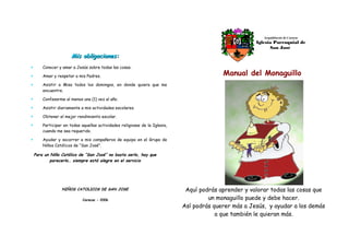 Este documento presenta las obligaciones de un niño católico como parte de un grupo de niños católicos. Las obligaciones incluyen conocer y amar a Jesús, amar y respetar a los padres, asistir a misa los domingos, confesarse al menos una vez al año, asistir a la escuela, participar en actividades religiosas de la iglesia y ayudar a otros compañeros del grupo.