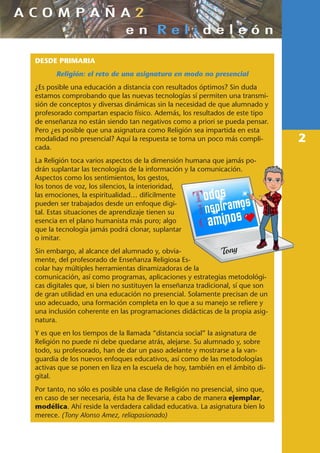 El documento habla sobre la importancia de que la música del Evangelio siga sonando en los cristianos para mantener la alegría, compasión y capacidad de reconciliación. También destaca los retos de enseñar Religión de forma no presencial debido a aspectos como las emociones que son difíciles de transmitir digitalmente, pero que existen herramientas que pueden ser útiles siempre que se usen de forma adecuada. Finalmente, resalta la necesidad de dar apoyo a los alumnos con más dificultades ya que son "