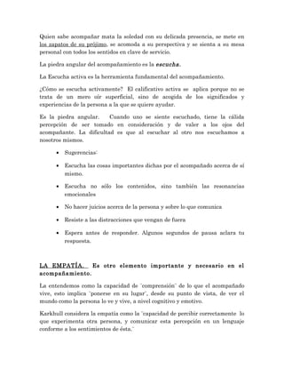 El documento habla sobre el tema del acompañamiento. Explica que acompañar significa "comer pan juntos" y estar disponible para escuchar los sentimientos y esperanzas del otro. Ser un buen acompañante requiere escuchar activamente, ponerse en los zapatos del otro con empatía y evitar ser directivo. La escucha activa y la empatía son elementos fundamentales del acompañamiento.