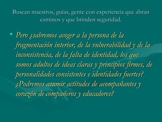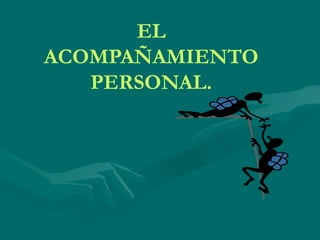 El documento describe el acompañamiento personal como un proceso de ayudar a las personas a conocerse a sí mismas, aceptarse, discernir su vocación y realizar un proyecto de vida significativo. El acompañamiento requiere cualidades como la comprensión, la paciencia, la madurez y la formación por parte del acompañante para establecer una relación interpersonal auténtica que apoye el crecimiento de la persona acompañada.