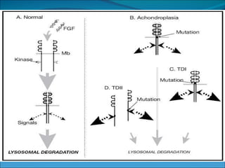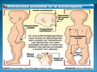 La acondroplasia es una forma de enanismo autosómico dominante que ocurre en 1 de cada 30,000 personas, causada por mutaciones en el gen FGFR3 que codifica el receptor de factor de crecimiento fibroblástico 3. Los acondroplásicos tienen huesos largos no desarrollados adecuadamente y alcanzan una altura predecible de entre 122-144 cm para varones y 117-137 cm para mujeres. No existe tratamiento para aumentar la estatura, solo cirugía de alargamiento de huesos.