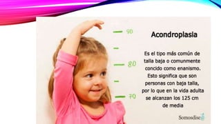 La acondroplasia es una enfermedad genética que causa enanismo, afectando el crecimiento óseo y la proporción del cuerpo, y es frecuentemente causada por mutaciones en el gen FGFR3. Aunque no tiene cura, existen tratamientos para manejar sus síntomas y complicaciones, como elongación ósea y cirugía para correcciones. Las personas con acondroplasia suelen tener una inteligencia normal y pueden llevar vidas activas con un adecuado control médico.