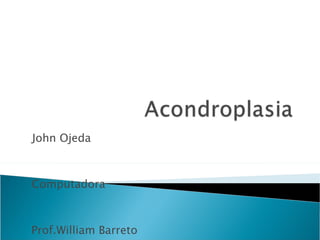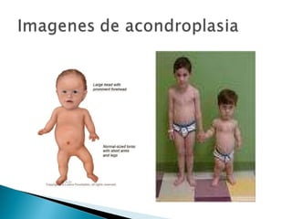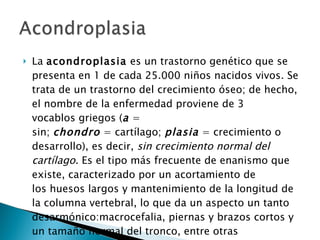 La acondroplasia es un trastorno genético del crecimiento óseo que causa enanismo y afecta a 1 de cada 25.000 niños. Se debe a mutaciones en el gen FGFR3 que codifica el receptor 3 del factor de crecimiento fibroblástico. La mutación puede ser heredada de los padres o surgir de novo, y causa un acortamiento de los huesos largos con mantenimiento de la longitud de la columna vertebral.
