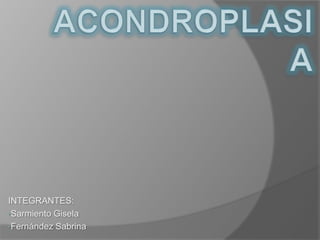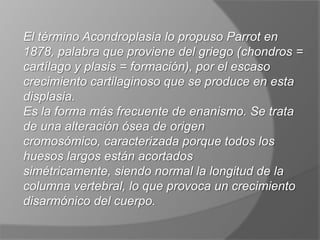 La acondroplasia es la forma más común de enanismo causado por una mutación genética. Se caracteriza por huesos largos acortados y cabeza grande. No tiene cura, pero el tratamiento incluye terapia física, cirugía y manejo de complicaciones como dolor de espalda, problemas respiratorios y dentales. Los padres con un hijo acondroplásico tienen un 25% de posibilidades de que se repita la condición en futuros hijos.