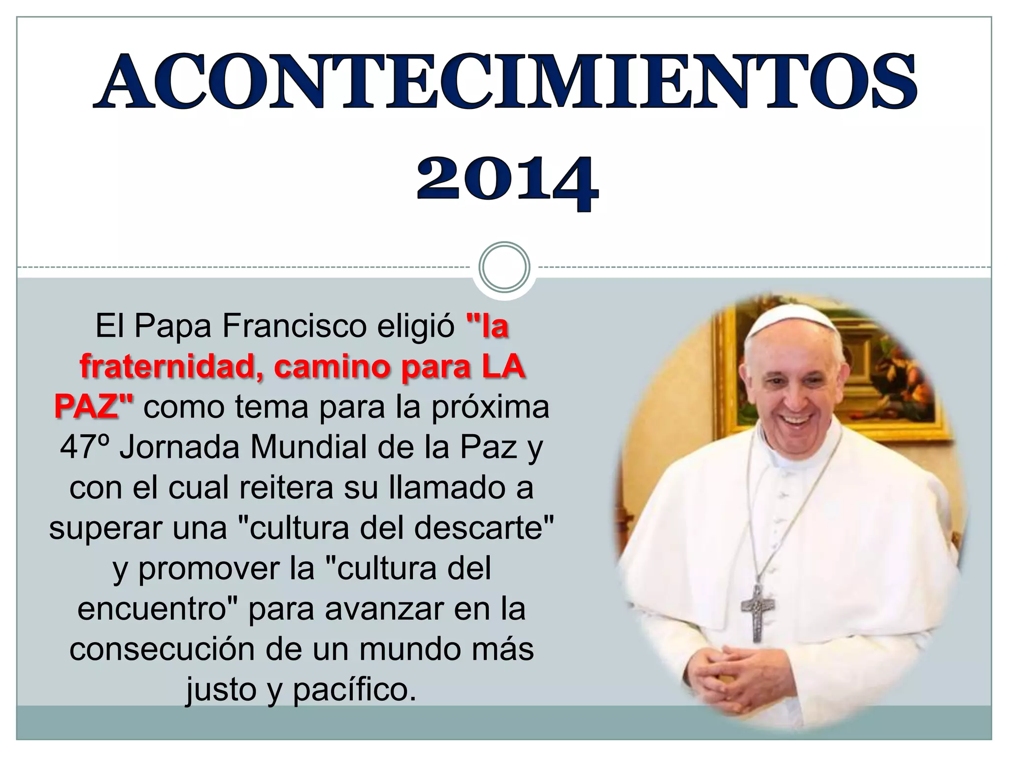 El Papa Francisco eligió "la fraternidad, camino para LA PAZ" como tema para la próxima Jornada Mundial de la Paz. También convocó una Asamblea General Extraordinaria del Sínodo de los obispos sobre "Los desafíos pastorales de la familia". En abril canonizará a Juan XXIII y Juan Pablo II. Las Naciones Unidas declararon 2014 como el Año Internacional de la Agricultura Familiar.
