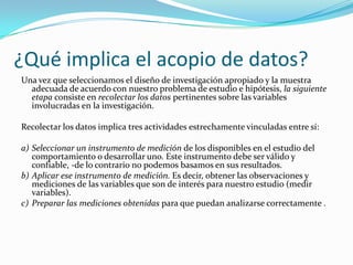 El documento describe los pasos involucrados en la recolección y procesamiento de datos para una investigación. Estos incluyen seleccionar un instrumento de medición válido y confiable, aplicar el instrumento para obtener mediciones de las variables de interés, y preparar los datos para su análisis. También discute los requisitos de validez y confiabilidad que debe cumplir un instrumento de medición, y los pasos para construir e interpretar un instrumento.