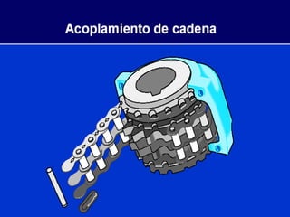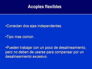 La alineación es el proceso de alinear el eje de una máquina como un motor con el eje de otra máquina acoplada como una bomba para eliminar esfuerzos no deseados, lograr una mayor durabilidad y disponibilidad, y ahorrar costos. Existen varios métodos de alineación y tipos de acoples como acoples rígidos, acoples elásticos, embragues y cadenas que conectan máquinas. La falta de alineación puede causar sobrecalentamiento, vibraciones y desgaste prematuro.