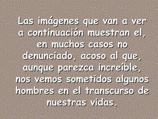 El documento describe brevemente el acoso que algunos hombres experimentan en sus vidas, aunque a menudo no se denuncia. Las imágenes fueron tomadas en secreto por una cámara porque en este caso particular, la víctima del acoso se atrevió a denunciar su situación. Se informa que la acosadora fue expulsada de la guardería donde ocurrió el incidente.