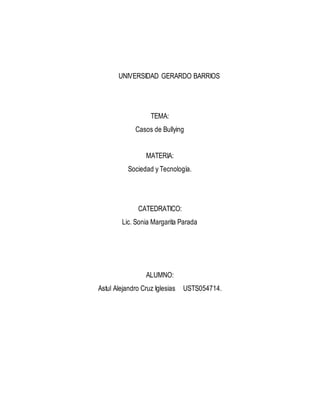Este documento presenta varios casos de bullying y ciberbullying que ocurrieron entre adolescentes y niños. Incluye ejemplos de acoso en línea a través de redes sociales y mensajes que llevaron a algunas víctimas al suicidio. También describe casos de humillación pública a través de fotos y videos compartidos en internet sin consentimiento de las víctimas.