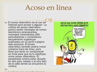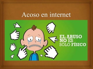 El documento habla sobre diferentes tipos de acoso cibernético y comportamientos dañinos en línea. El acoso cibernético involucra el uso de internet para acosar a alguien a través de mensajes amenazantes o comentarios inapropiados. El cyberstalking implica el seguimiento y la investigación constante de alguien de manera no deseada a través de redes sociales y otros medios. El flaming se refiere a enviar mensajes hostiles o insultantes sin propósito constructivo en foros o correos electrónicos con el objetivo