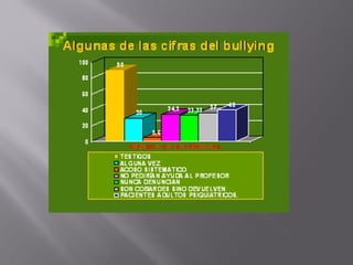 El acoso escolar es un maltrato continuo y deliberado que sufren los niños, manifestándose a través de agresiones físicas, verbales, psicológicas y sociales. Aproximadamente un 6% de los alumnos españoles han sido víctimas de bullying, y una gran parte de ellos no denuncia estas situaciones por miedo o falta de apoyo. Las causas del acoso incluyen dificultades de integración social, baja autoestima y la falta de intervención por parte de padres y profesores.