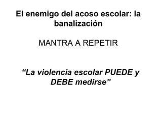 Este documento presenta los resultados de un estudio sobre el acoso y la violencia escolar en España. Analiza los principales comportamientos de acoso reportados por los estudiantes y su asociación con daños psicológicos como el estrés postraumático. Algunos de los comportamientos más frecuentes incluyen llamar por motes, no hablarle a alguien, reírse de ellos cuando se equivocan e insultarles. Los estudiantes que reportan estos comportamientos de forma muy frecuente tienen entre 4 y 6 veces más probabilidades de experimentar daños