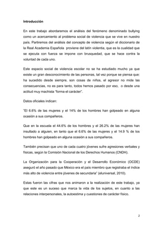Este documento describe la investigación sobre la expresión del bullying en la Escuela Secundaria Diurna #125 "Pablo Casals" en Tlalpan, Ciudad de México. Explica conceptos clave como violencia, agresión y bullying. Presenta datos sobre la prevalencia de la violencia entre estudiantes. El objetivo es identificar cómo se manifiesta el bullying en esta escuela a través de entrevistas y cuestionarios a directivos, maestros y alumnos.