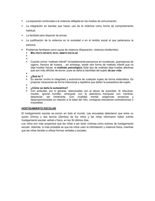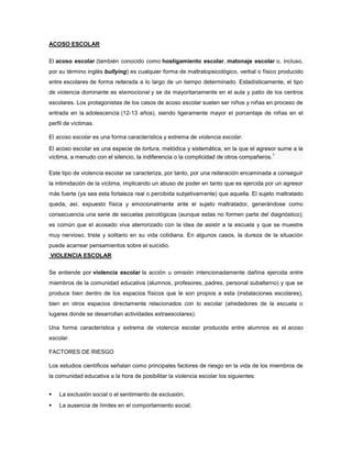 El acoso escolar es cualquier forma de violencia psicológica, verbal o física que sufre un estudiante de forma reiterada por parte de otros compañeros. Generalmente, los agresores y víctimas tienen entre 12 y 13 años. El acoso escolar se caracteriza por ser una tortura sistemática que somete a la víctima a abuso de poder físico o psicológico. El hostigamiento escolar ocurre en todo el mundo y afecta entre el 20% al 66% de estudiantes, siendo los niños más propensos a ser tanto víctimas