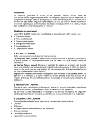 Este documento define el acoso laboral y establece seis modalidades de este según la ley colombiana 1010 de 2006: 1) Maltrato laboral, que incluye violencia física, psicológica y sexual, así como expresiones verbales dañinas. 2) Persecución laboral mediante sobrecarga laboral y cambios de horario. 3) Discriminación laboral por raza, género, religión u origen. 4) Entorpecimiento laboral obstaculizando el trabajo del empleado. 5) Inequidad laboral asignando funciones