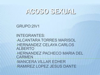 Este documento habla sobre el acoso sexual y cómo se manifiesta en diferentes entornos como escuelas, trabajos y lugares públicos. Explica que el acoso sexual involucra agresiones que van desde molestias hasta abusos serios relacionados con la actividad sexual. Recomienda acciones que puede tomar la víctima como pedir ayuda, documentar lo ocurrido y denunciar ante las autoridades correspondientes. También menciona centros como el INMUJERES que ofrecen apoyo gratuito a quienes sufren acoso sexual.