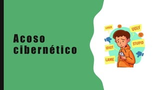 El documento trata sobre el ciberacoso y sus consecuencias. Explica que el ciberacoso es acoso o intimidación a través de tecnologías digitales como redes sociales y mensajería, con el objetivo de atemorizar, enfadar o humillar a otros de forma repetida. Sus efectos psicológicos en los menores suelen ser graves, dañando su autoestima y capacidad de relacionarse, pudiendo llevar a la depresión. El ciberacoso también afecta a la dignidad de sus víctimas de forma pública,