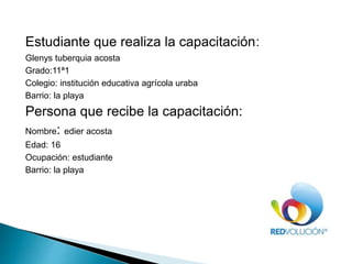 Glenys Tuberquia Acosta capacitó a Edier Acosta, un estudiante de 16 años que vive en el barrio La Playa, para enseñarle a usar su celular. Durante sesiones de dos horas dos veces por semana, Glenys le enseñó a Edier cómo reiniciar y apagar su celular, descargar aplicaciones como Facebook y WhatsApp, y buscar temas e información en línea que le interesan. La experiencia de capacitar a Edier fue estresante al principio pero exitosa, ya que Edier aprendió a manejar bien