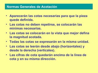 El documento establece las normas básicas para la acotación de planos técnicos, incluyendo que solo se incluirán las cotas necesarias, se expresarán en la misma unidad y se leerán desde abajo y la derecha, y que las líneas de acotación no se cruzarán entre sí ni con otras líneas.
