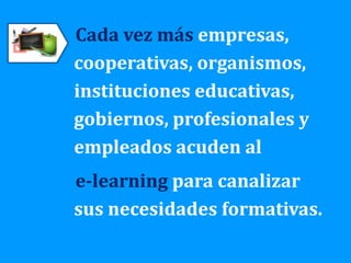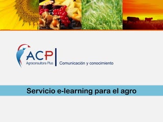 El documento presenta un servicio de e-learning diseñado para el sector agro, abordando las necesidades de formación de empresas, cooperativas e instituciones. Detalla los cuatro pilares del servicio, que incluyen cursos a medida, diseño de materiales, un catálogo propio y la instalación de plataformas virtuales personalizadas. Además, resalta los beneficios de contar con un LMS propio, como la capacitación continua del personal y la creación de nuevas unidades de negocio para ofrecer capacitaciones a distancia.