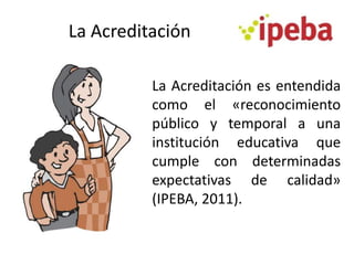 El documento presenta información sobre el Sistema Nacional de Acreditación "CCCA-IPEBA" en Perú. Explica que la acreditación es el reconocimiento público y temporal a instituciones educativas que cumplen con estándares de calidad. Luego describe la Matriz de Evaluación y Guía de Autoevaluación para la Acreditación, las cuales contienen estándares de calidad de gestión educativa organizados en factores como dirección institucional, desempeño docente, trabajo con familias y comunidad, uso de información e infraestructura. Finalmente,
