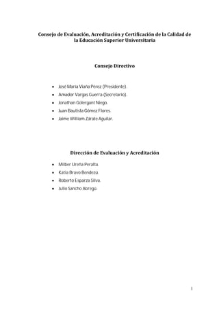 El documento presenta los estándares de calidad para la acreditación de las carreras profesionales universitarias de Medicina, Enfermería y Obstetricia establecidos por el Consejo de Evaluación, Acreditación y Certificación de la Calidad de la Educación Superior Universitaria (CONEAU). Describe el modelo de calidad del CONEAU que incluye tres dimensiones, nueve factores, dieciséis criterios y ochenta y cuatro indicadores. Además, explica los antecedentes legales que dieron origen al CONEAU y