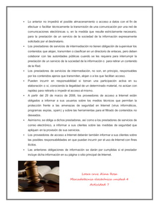 La Ley 34/2002 establece nuevos derechos y obligaciones para los prestadores de servicios de la sociedad de la información. Los prestadores deben indicar en su página web su nombre, datos de contacto, NIF, información de precios, autorizaciones requeridas, códigos de conducta, y cómo usan y almacenan datos de usuarios. Los proveedores de acceso a Internet deben informar a usuarios sobre protección contra amenazas en línea y herramientas de filtrado, así como sobre sus propias medidas de seguridad y posibles responsabilidades