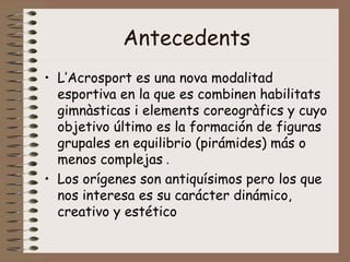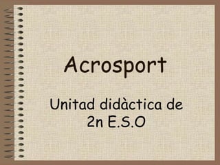 Este documento describe la modalidad deportiva del acrosport, que combina habilidades gimnásticas y elementos coreográficos para formar figuras grupales en equilibrio. Explica los objetivos de desarrollar la cooperación, sensibilidad artística y creatividad. Detalla las técnicas básicas como diferentes tipos de presas de manos, posiciones del portor y ágil, y normas de seguridad. Propone actividades como identificar presas, portores y ágiles en imágenes y ejecutar pirámides propuest