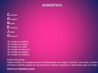 Los documentos presentan acrósticos sobre conejos y sus características usando las letras de la palabra "CONEJO". Cada documento contiene un acróstico, una historia corta sobre un conejo y su autor. Los conejos se describen como cariñosos, obedientes, nobles y jugadores.
