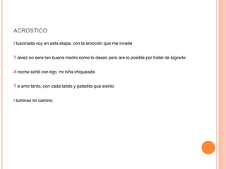 Este poema es un acróstico en el que cada letra inicial de cada estrofa forma la palabra "MATERNIDAD". La autora expresa su amor y ansiedad por la llegada de su bebé, a quien describe como su motor, ilusión y fuente de alegría. También menciona los miedos y preocupaciones de ser madre por primera vez.
