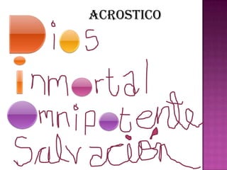 Un acróstico es un poema en el que las letras iniciales de cada línea, leídas en orden, forman una palabra o frase. Los autores Deborah G. Elias, Diego G. Castaneda y Robin E. Elias escribieron este artículo para explicar qué es un acróstico y dar ejemplos de cómo se puede escribir uno.
