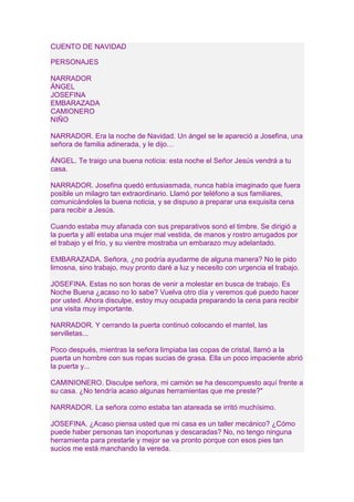 El acróstico de Navidad presenta versos que comienzan con las letras de la palabra "Navidad" describiendo escenas de la Navidad y la vida de Jesús. El cuento de Navidad narra la historia de Josefina, a quien un ángel le anuncia que Jesús vendrá a su casa en Navidad. Josefina se prepara para recibirlo pero rechaza a una mujer embarazada, un camionero y un niño que piden ayuda. Al no llegar Jesús, se decepciona. El ángel luego le explica que Jesús sí vino