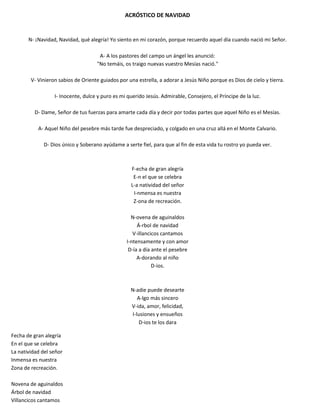 El acróstico de Navidad describe los eventos del nacimiento de Jesús a través de las letras de la palabra "NAVIDAD". Jesús nació como un niño inocente para ser el futuro Mesías. El poema pide a Dios fuerza para amarlo cada día y ver su rostro en el cielo.