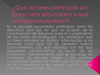 En la escuela secundaria participan directivos, profesores, alumnos, personal de mantenimiento y padres de familia, quienes establecen relaciones a través de las diversas actividades diarias y especiales. Los directivos coordinan el cumplimiento de las metas escolares, los profesores enseñan a los alumnos, y el personal de mantenimiento se encarga de la limpieza. Fuera del aula, los alumnos juegan en los recreos mientras el personal de mantenimiento limpia, y los padres apoyan en la cooperativa. Durante event