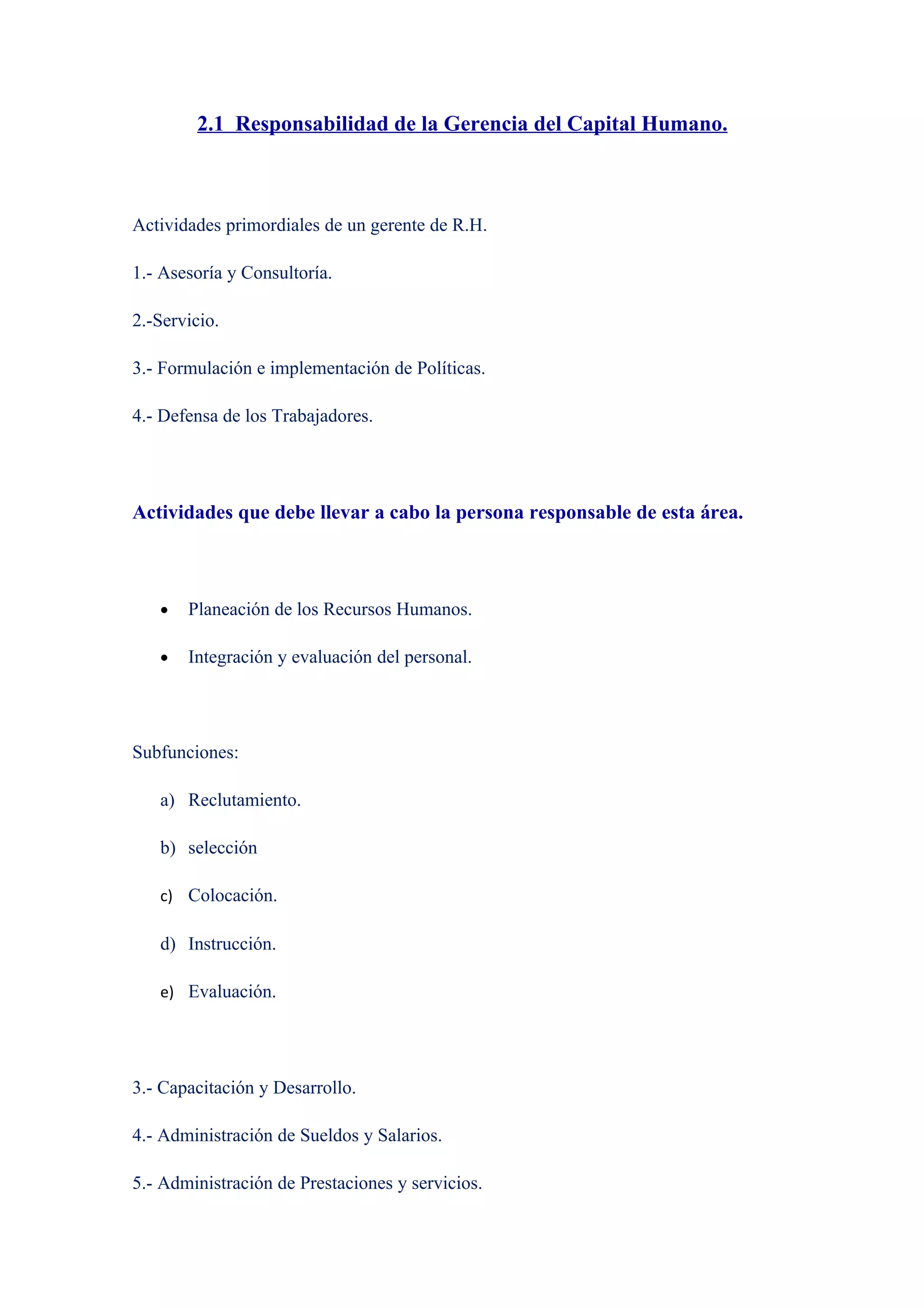 El documento describe las responsabilidades y funciones clave de la gerencia de recursos humanos, incluyendo la planificación, reclutamiento, capacitación, evaluación del personal, administración de compensaciones y prestaciones, relaciones laborales, y el desarrollo de la sensibilización del capital humano mediante técnicas de motivación. También discute elementos como la cultura organizacional, liderazgo integrador, e innovación a través de nuevas tecnologías.