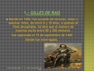 El documento describe brevemente las vidas y crímenes de varios asesinos seriales notorios, incluyendo su país de origen, las fechas de nacimiento y muerte, el número de víctimas, y los métodos utilizados como tortura, violación, decapitación, canibalismo y más.