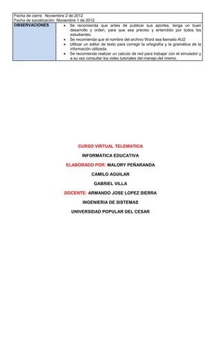 Este documento presenta una guía para una actividad en un curso virtual de telematica sobre redes en el simulador Cisco Packet Tracer. Los estudiantes deben crear una red con routers, switches, puntos de acceso y dispositivos móviles y cableados, y responder preguntas sobre la configuración de la red. Deben publicar capturas de pantalla de su red en Facebook y enviar un documento Word con las respuestas a un correo electrónico antes de una fecha límite.