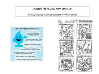La canción "El agua es vida, cuidala" enseña a los niños a no desperdiciar el agua a través de cantarla, bailarla con diferentes ritmos, usar gestos para explicarla, y cantarla en grupo. El video también explica por qué debemos aprovechar el agua y da consejos sobre su uso responsable, mientras los niños cuentan las personas que aparecen.