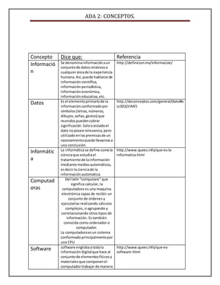 El documento describe diferentes conceptos relacionados con la informática como información, datos, software, hardware, procesador, sistema operativo, archivos, redes, Internet, USB y multimedia. Define cada concepto y proporciona una referencia para obtener más información.