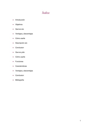 El documento describe dos herramientas para crear sitios web gratuitas llamadas Wix y Yola. Wix permite crear sitios web personalizados fácilmente arrastrando y soltando elementos sin necesidad de saber codificar. Yola también facilita la creación de sitios profesionales de forma rápida y dinámica. Ambas herramientas son gratuitas pero Wix incluye anuncios mientras que Yola permite subir archivos de audio.