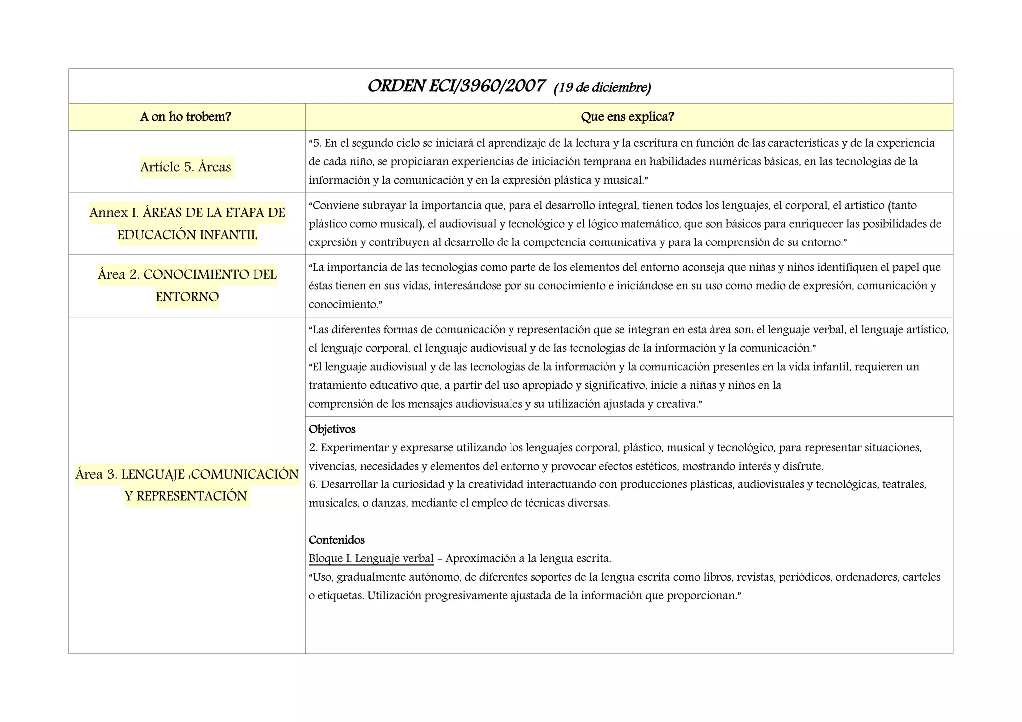 El documento describe las áreas de aprendizaje y objetivos para la etapa de educación infantil, incluyendo el aprendizaje de la lectura, escritura, habilidades numéricas, expresión artística, y el uso de tecnologías. Explica la importancia de diferentes lenguajes como el corporal, artístico, audiovisual y tecnológico. También describe el uso de materiales como ordenadores, cámaras y libros para iniciar a los niños en el uso de la tecnología y expresión a través de diferentes medios.