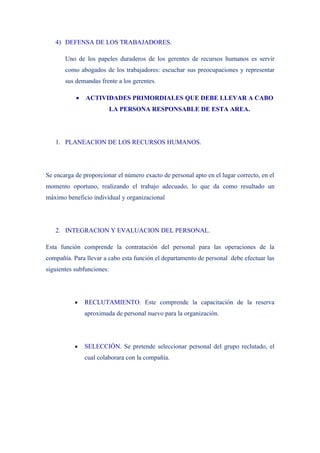 Este documento describe las principales responsabilidades y competencias de un gerente de recursos humanos. Las responsabilidades primarias incluyen asesoría y consultoría, servicios como reclutamiento y capacitación, formulación e implementación de políticas, y representación de los trabajadores. Las competencias clave son dominio del trabajo y los recursos humanos de la organización, habilidad para gestionar el cambio, y establecer credibilidad personal.