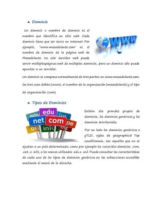 Este documento presenta una investigación sobre dominios, tipos de dominios, proveedores de hosting y sus costos. Explica que un dominio identifica un sitio web de forma única e incluye la extensión como .com. Luego describe los dominios genéricos como .com y los territoriales como .mx. Finalmente, lista varios proveedores de hosting gratuitos y sus características, así como los costos de registro de diferentes dominios.