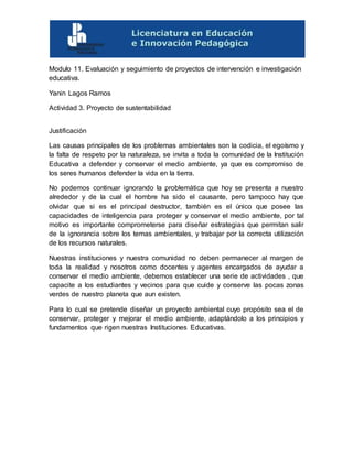 Este documento describe un proyecto de sustentabilidad ambiental dirigido a concientizar a la comunidad educativa sobre la importancia de conservar el medio ambiente. El proyecto tiene como objetivos promover el uso eficiente de recursos naturales, realizar actividades para generar conocimiento crítico sobre la destrucción de la naturaleza, y motivar la participación de estudiantes y la comunidad en mejorar el entorno ambiental a través de actividades como el reciclaje y la conservación de áreas verdes.